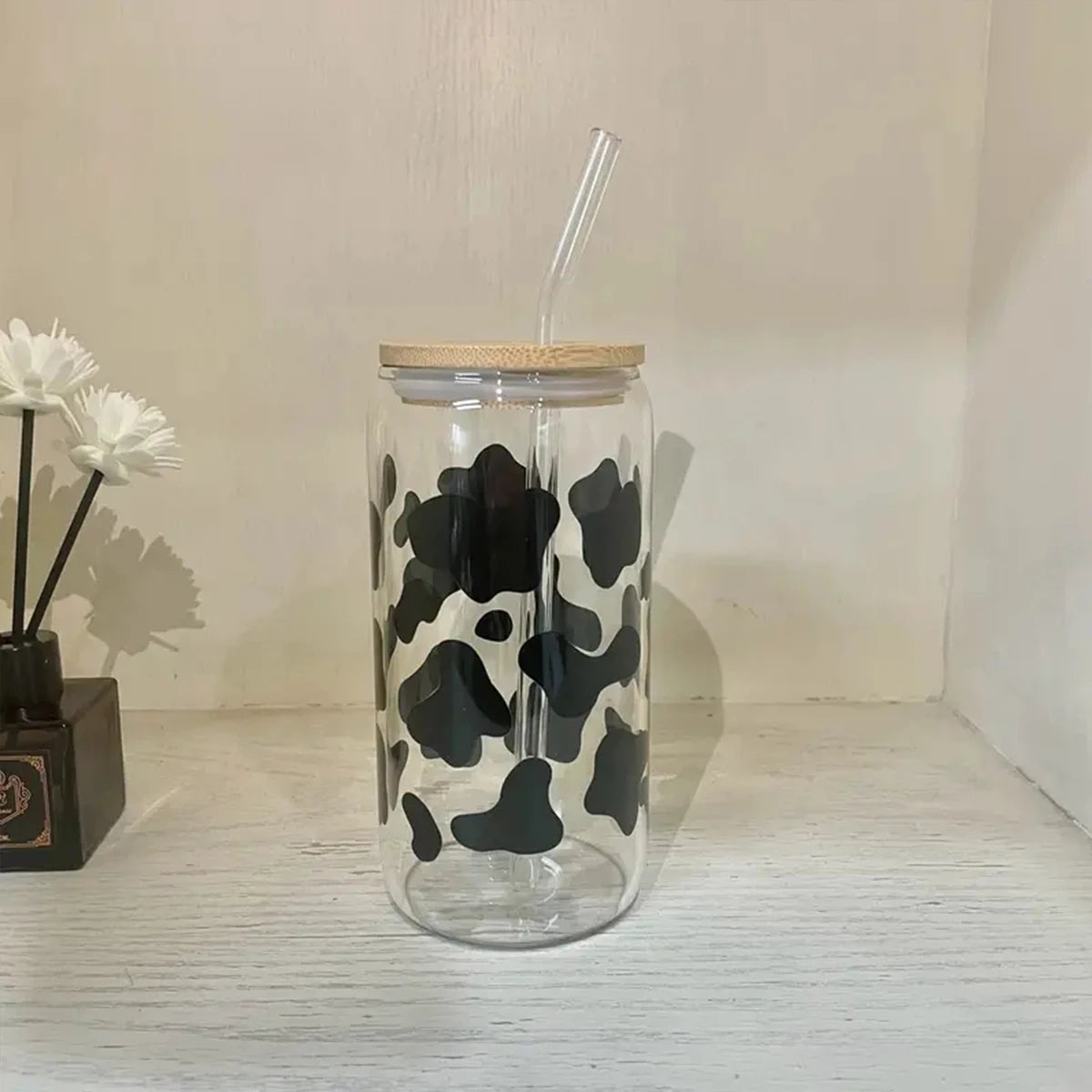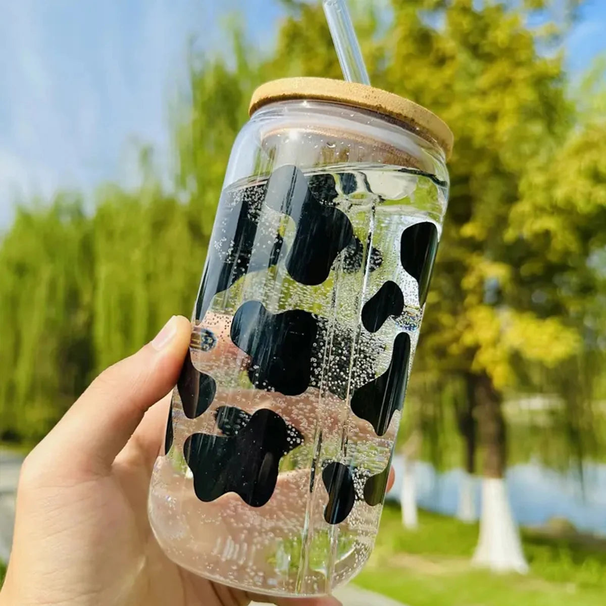 Unser Trinkglas mit Milchkuh-Design bietet 17oz Spaß für eiskalten Kaffee und Getränke.